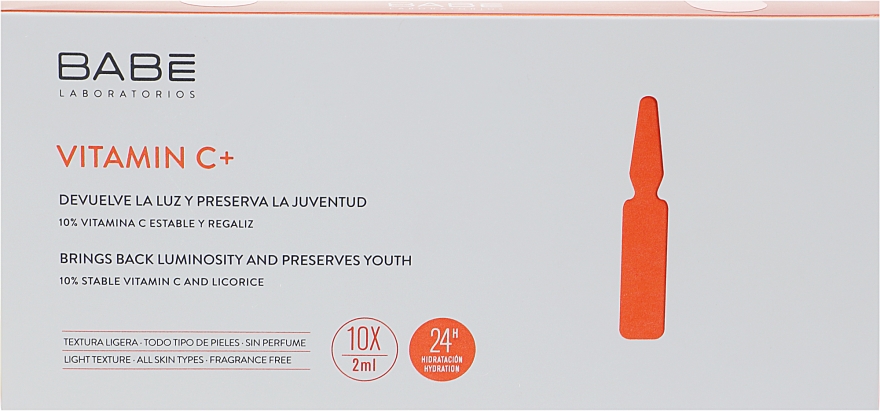 После курсового использования ампул Babe Laboratorios Ampule Solution Vitamin C+ будьте готовы порощаться с пигментацией и тусклым оттенком личика. Формула концентрата обогащена 10% витамином С в комбинации с экстрактом корня солодки, которые оказывают эффективное осветляющее и антиоксидантное действие, насыщают кожный покров влагой, препятствуя обезвоживанию и сухости, уменьшают выраженность пигментных пятен любого генеза, выравнивают тон личика, возвращая ему красивый и сияющий вид.