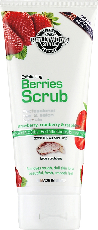 Скраб Hollywood Style Exfoliating Berries Scrub деликатно и тщательно очищает кожу от загрязнений, отшелушивает омертвевшие клетки кожи, придавая личику свежий и обновленный вид. Натуральные экстракты ягод насыщают кожу витаминами, кислородом и питательными веществами, способствуют осветлению пигментации и борятся с неровным тоном кожного покрова, а так же защищают дерму от пагубного влияния окружающей среды.