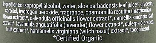 Активные компоненты: 75% изопропилового спирта, 3% перекиси водорода, алоэ вера, глицерин, экстракт календулы, экстракт гамамелиса, экстракт лаванды.